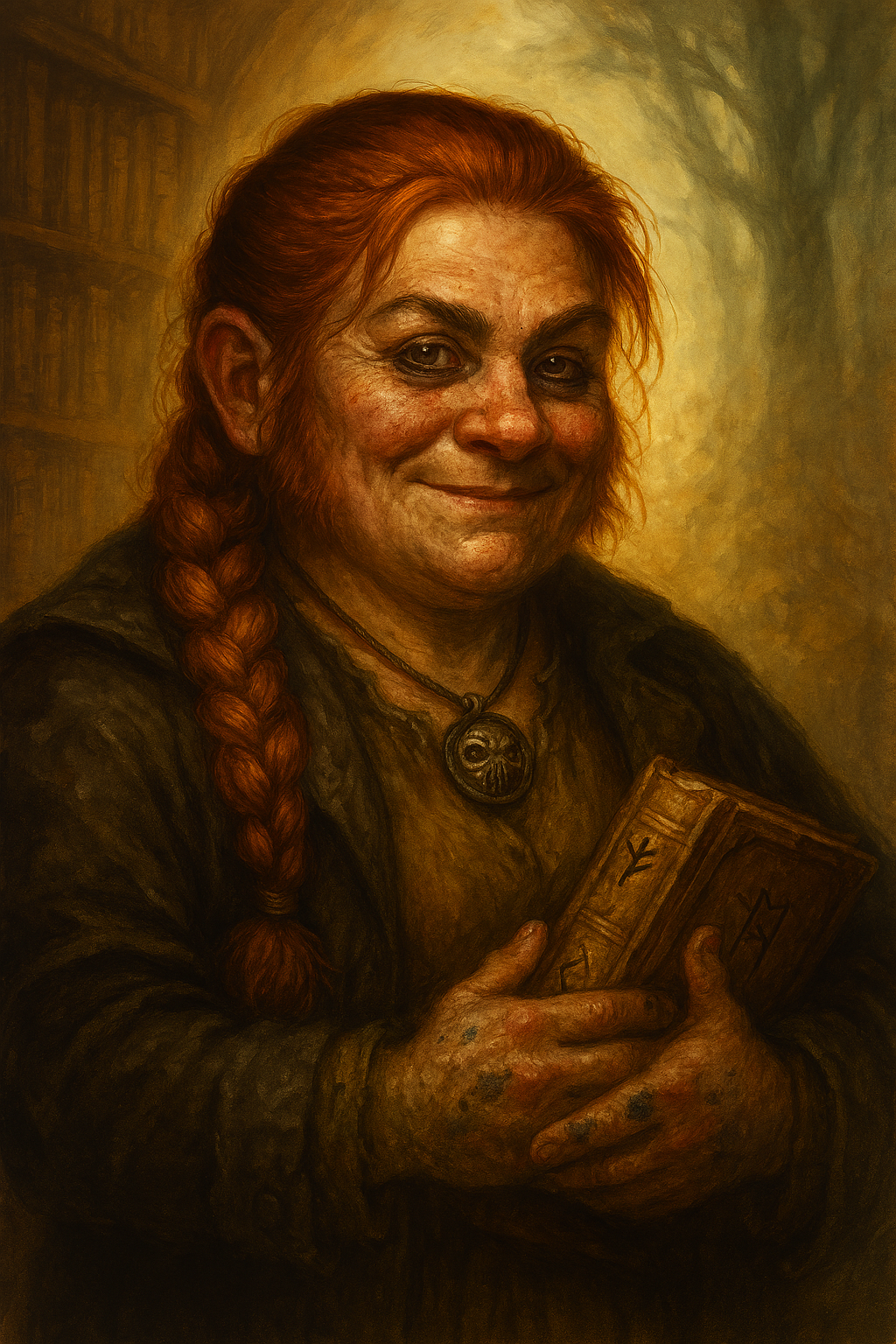 Sie hieß Runhild Kupferfaust und war mit ihren 104 Jahren eine ehrwürdige, aber noch junge Zwergin. Ihr Leben hatte sie den alten Schriften und Runen gewidmet, die in den Hallen ihrer Bergheimat verborgen lagen. Blass und fahl wirkte sie, als sei sie selbst ein Relikt aus den Archiven, mit Tintenflecken an den Fingern und Augenringen, die von langen Nächten über bröckelnden Pergamentrollen erzählten. Doch hinter diesem gelehrten Antlitz glomm eine unersättliche Gier – nach Wissen, nach Gold, nach allem, was glänzte und Geheimnisse barg.